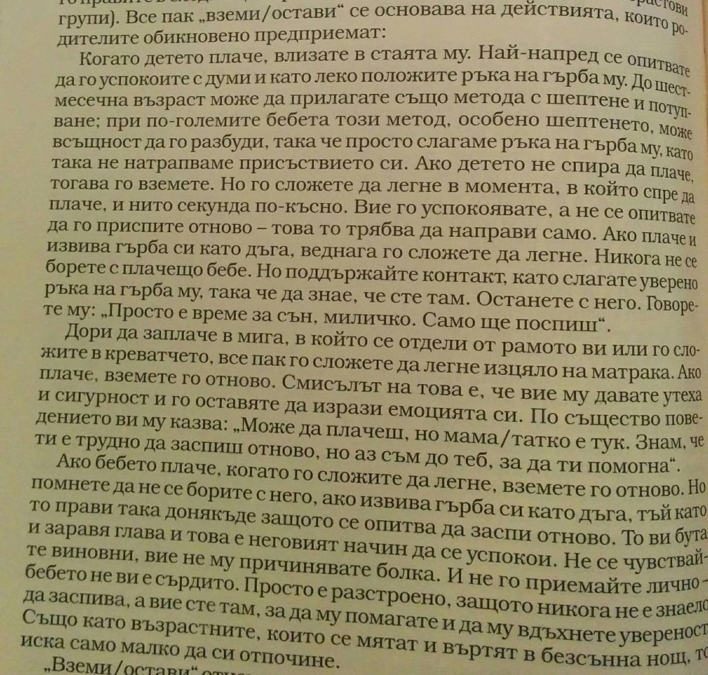 За да се приучи сега обаче тепърва към режим, трябва упорство и спазване на една техника за приучаване на бебчето да спи в собственото си легло през деня, която се казва "вземи/остави". Държа дебело да подчертая, че авторката е твърдо против оставянето на бебето да се наплаче и казва, че това само може да разуши доверието му към родителя, след което въвеждането на какъвто и да било режим би било изключително трудно.