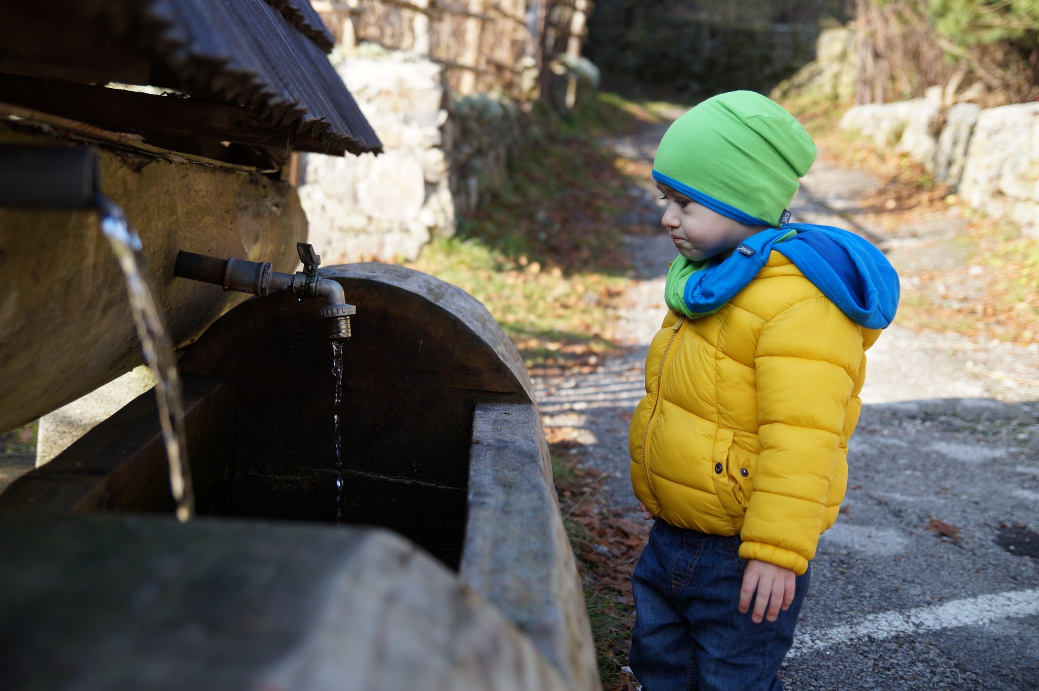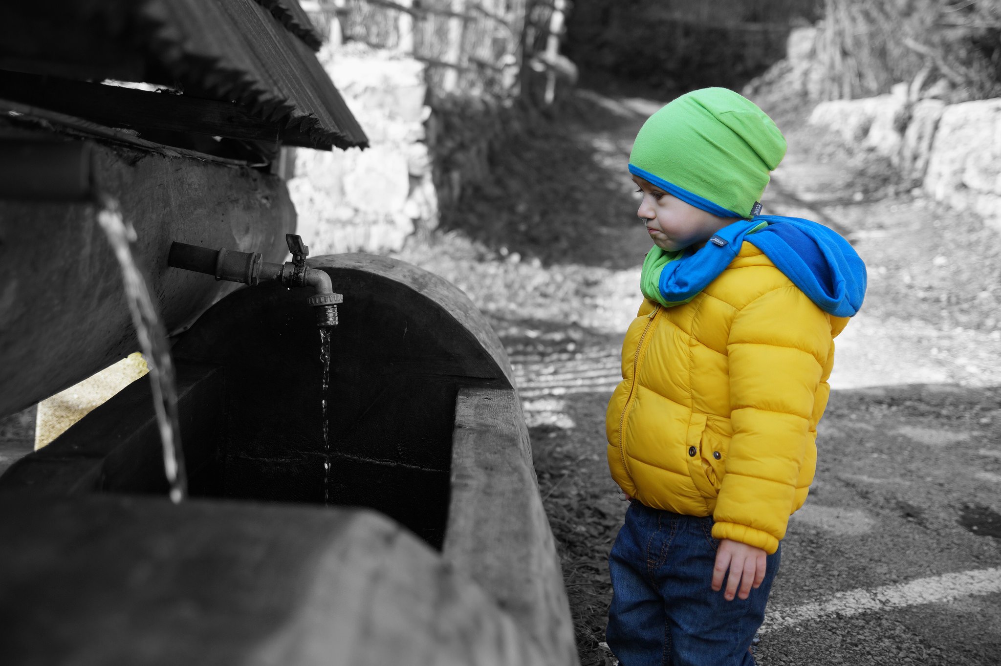 Лицето е студено, защото има каст от синьо-зелената дрешка на детето. Може да се махне с обработка - има много тюториали в нета. Не се наемам да обяснявам как, защото още не съм махала кастове успешно, но може би и някой друг ще се включи. Също така гледай да не "отрязваш" обекта през ставите. От първите две, може би първата, защото на втората наблягаш само на детенцето, а за мен чешмата е важна за кадъра. Или пък изцяло чб.