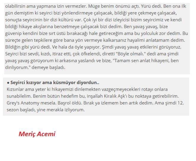 - Мюге, открыла мне фронт(двери). Сказала идти. Я в первый день говорила ей, зрители попытаются нас направлять, попытаются взять нас с собой туда, куда они сами хотят, в конце концов у зрителя есть (сформировавшаяся) сериальная культура. Наши зрители, очень хорошая сериальная аудитория и они попытаются сделать так, чтобы мы шли по их течению. Я сказала, я постепенно приведу их в то состояние, когда они будут полностью доверять нам, но этот путь очень тяжелый. И в этом процессе, если вы попытаетесь давать мне советы смотря на предложения, приходящие от зрителей, то я не смогу рассказать свою мечту (рассказать свои мысли). Сказали, двигайся вперёд, как хочешь (как сама знаешь). И все ещё делают так. Сейчас время от времени видим влияние. Зрители нас полюбили, обижались, протестовали, очень рассердились, настаивали, говорили: "Так должно быть", но сейчас постепенно вижу, "откинулись назад" и начали говорить "Ладно, ты рассказывай историю, я буду слушать".