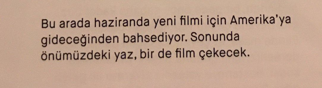 Он проявляет очень много интереса к своей профессии. Он рассказывает о своей жизни так, словно в этот миг играет в каком-то фильме. Я попросил у него рассказать мне об одной сцене. Но не придуманное, а то, что на самом деле взволновало его в жизни... "Я с братом отправился в Чанаккалу на рыбалку. 2 года назад... Мы были на одном судне. Пара рыбаков и два капитана помогали нам. Настало время обеда. Один из капитанов накрыл стол. Что за стол? Он был накрыт лишь простой газетой. Нас -четверо, на столе два небольших хлеба, белый сыр, салат, картофель и около 20 штук оливок. Один из капитанов взял оливку, одну половину съел, а другую половину положил на газету, чтобы съесть потом. Одну оливку он ел с двумя-тремя кусками хлеба. Был сильный ветер. Хоть и было солнце, но было очень холодно. Это был наш самый прекрасный обед... Мне кажется, что я вышел в путь среди ночи именно для того, чтобы прожить тот миг. До самой Чанаккалы я водил..."