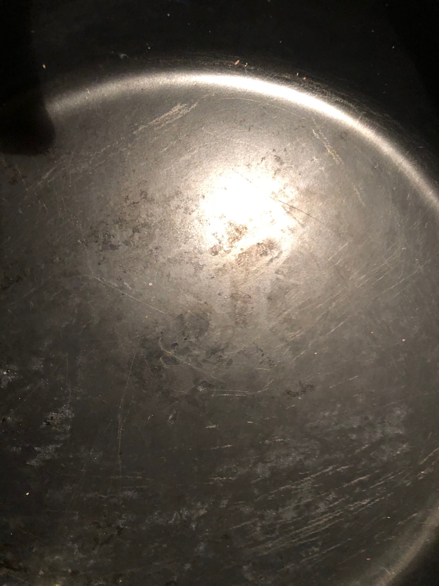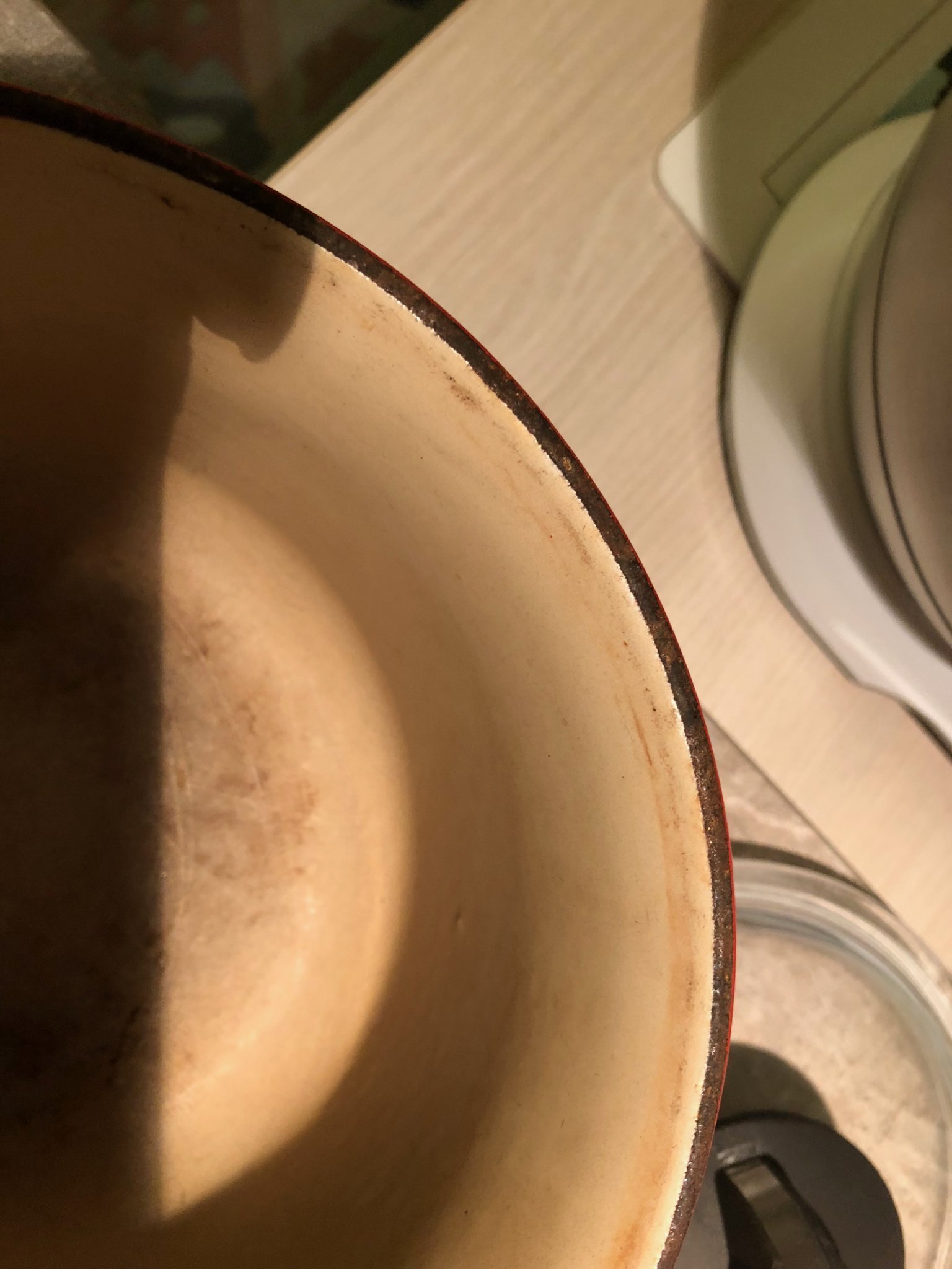 Дъното на малка касерола Крюзе. Това на дъното е патина, не загоряло. В нея става най-вкусният ориз , който съм яла. Много съм навита на голяма тенджера Льо Крюзе, но вече купих гадните Силитки и още им е рано да ги хвърлям.