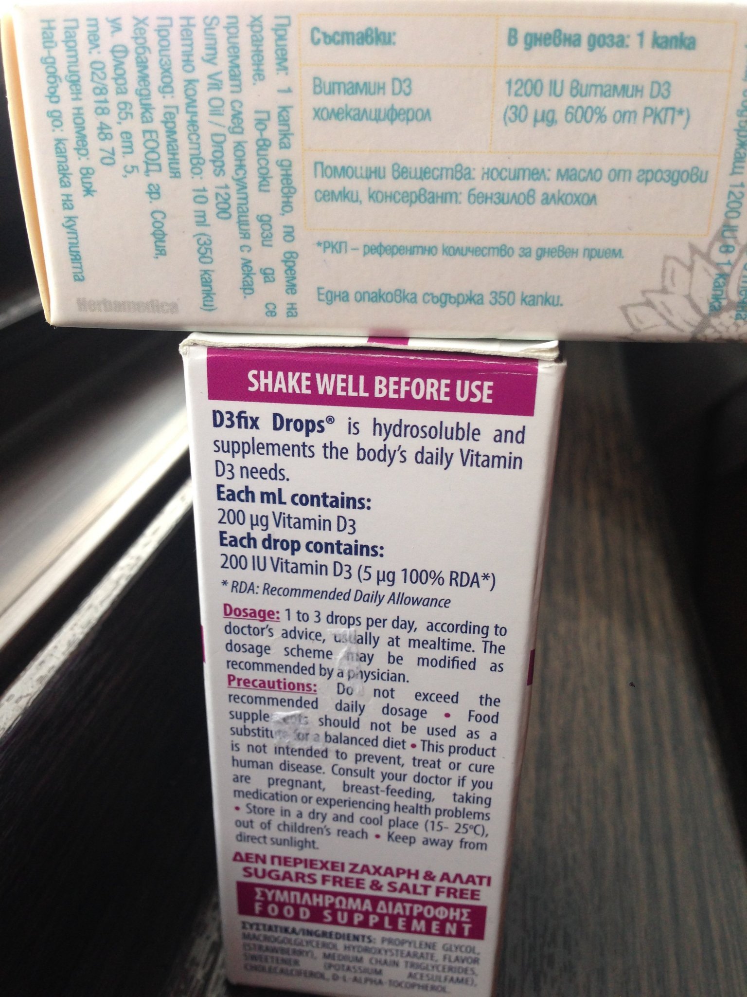 Не мога да разбера по колко капки да взимам...горната опаковка е от предишните от които взимах по 4-5капки са 1200 lU,тези от Гърция май са по-различни...200lU в капка