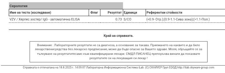 Аз и преди съм писала, много пъти съм била контактна, най-фрапиращо беше преди три години, когато голямото ми дете кара варицела, аз се грижех за нея и не се разболях, бях убедена, че съм боледувала като дете. Миналата година заедно с профилактичните си пуснах изследване и за VZV IgG, резултатът ме изненада (0,05, ако не се лъжа) и реших да се ваксинирам, после забравих всичко, до вчера. Пфу, цял живот ли ще ѝ треперя на тази гадост... Надявам се, изследванията да са грешни, ваксината да си свърши работата или просто отново да имам късмет както досега, не знам... Стискайте ми палци!