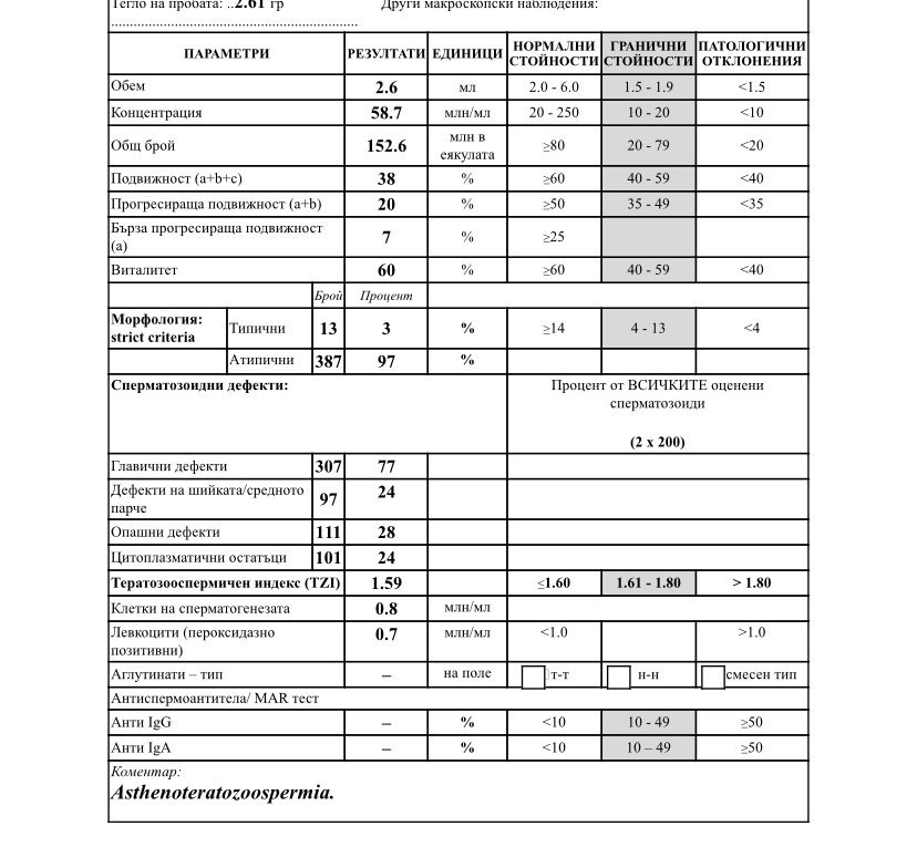 Опити за дете близо 5 години.Повече от 10 биохимични бременности, установен е само мъжки фактор. Декември 2012- ИКСИ, връщат 4 ембиона- завършва с биохимична бременност. Май 2013- бременност постигната с естествено зачеване. Приемал е няколко месеца през това време- цинк, пикногенол, бърканица и се е хранил умерено. Няма варикоцеле, не пуши, не пие, не е с наднормено тегло, спортува умерено. Причина за намалената оплодителна способност- физиологична.