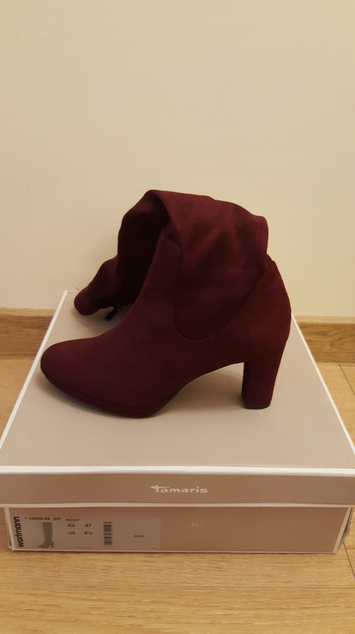 https://www.amazon.de/gp/product/B071GV2KKP/ref=oh_aui_detailpag … ie=UTF8&psc=1  текстилен ботуш Тамарис,цветът го мислех по-бордо,а се оказа повече към виолетово,отгоре е ластичен тип чорап,пак ми е широк на глезена,отвътре стелката е много мека,размер 37 . Има снимка в сайта как стои моделът обут по-надолу в коментарите .ток 7,5см, височина 44см, ширина горе 15,5см