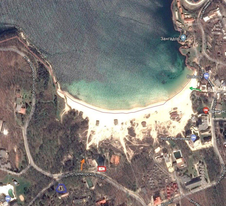 Ариана е със синьо в другия край на плажа. С оранжево е входа към плажа. В червено е станцията на МВР /почивна база Зеленика/. Намират се на стария път Китен-Приморско, този, който минава покрай плажа на ММЦ.
