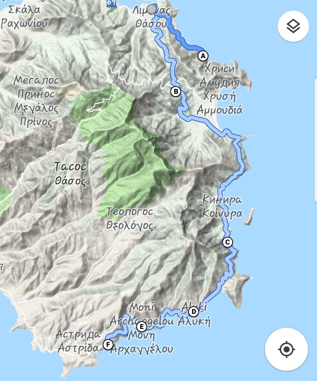 Близо до пристанището са Мраморният плаж(А), който е отклонение от пътя и е черен, прашен път, поне 1.5 часа и Панагия(B).  От Панагия може да отидете до манастира(Е на картата, за мен много красив и на живописно място), ще минете покрай плажа Парадайз(С) и Алики(D) -  разходка до древната мраморна мина, наблизо е Гьола(F), през деня си е доста горещо по пътя до него, разходката из Алики към един час, до Гьола поне 1.5 часа. Пътят минава и покрай Голдън бийч, ако искате да го видите какво представлява, защото доста го харесват, аз не.