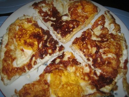 Взимате голям тефлонов тиган.Слагате 2-3 с.л олио и като загрее чуквате толкова яйца колкото да се покрие дъното на тигана.След като се понадуят и видите че са готови отдолу настъргвате сирене и кашкавал на ситно ренде и слагате подправки каквито обичате.Обръщате яйцата като внимавате да остане цяло и запичате и отдолу.