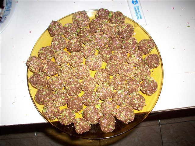 Направени са от натрошени бисквити "Закуска", остатъци от начупени и смачкани сладки, смлени фъстъци, кр. масло, какао, прясно мляко и вишнев ликьор - продуктите са на око , важно е да се постигне здрава топка тесто.