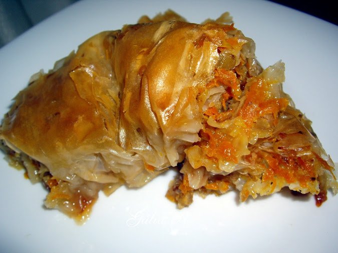 Омесва се тесто,оставя са да втаса.След това се точат кори,мажат се с мазнина,наръсва се със сирене,редят се така една върху друга и се пече. В моя случай съм навила корите на охлювче, нарязала, и съм ги подредила в тавата.
