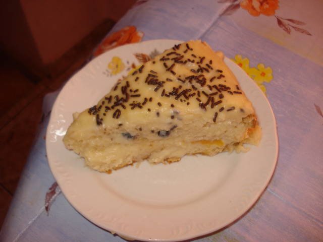 Сложих стафиди и малко праскови от компот,не съм снимала цялата торта,защото е в тава нямам тортена форма,заливах смело с крема и накрая тя буквално плуваше в него,а на сутринта си беше поела много добре всичко!