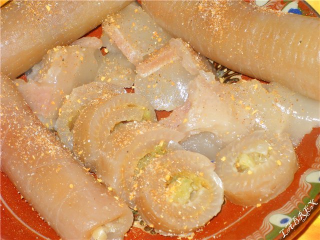 ей това сътворих от свинските кожички, дето питах какво да ги правя - рулца с подправки и праз лук и пача.