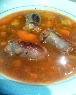 Задушаваме лука,моркова,чушката,чесъна в олиото.Като се по задушат се прибавя пипера и доматите и се налива вода.Като заври се прибавя лещата и наденицата ... оставяме да ври на слаб огън до готовност..