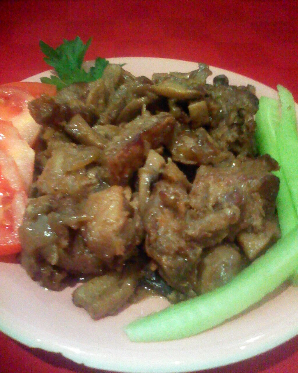 Като се по изпържи месото и си пусне водичка се прибавят нарязания на ситно магданоз,чубрицата,вегатата, червения пипер, зрънцата чер пипер и дафиновите листа начупени на две.