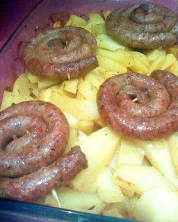 Отгоре се слагат кърначетата и се връща във фурната да се доизпекат картофите и кърначетата.