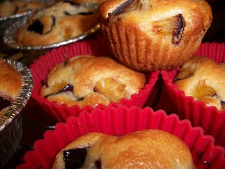 Сместа се изсипва в намаслените форми до средата се пълнят ,нареждат се сливите нарязани на парчета и се пече се на 180-200 градуса.