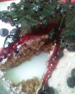 1/2 от сместа се изсипва в намаслена и набрашнена тава и се пече на 180-200 градуса /аз пека на скарата от печката на най долното за втория блат като се пече понякога дигам с едно нагоре/След като се захване блата и стане твърд,/като го пипнеш да е като изпечен кекс/но без да е запечен нацяло ,вадя и мажа със сладко от боровинки. Изсипвам другата половина от сместта в която съм сложила пресни или замразени боровинки и отново пъхам във фурната.Пече се на по-слаба температура 170-180 градуса до готовност.