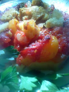 *Заливам с настърганите домати, сол,малко млян черен пипер, чесън на скилидки или нарязан , дафиновият лист.