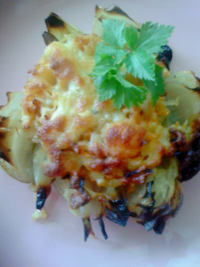 Сместа се разпределя най-отгоре върху лука. Пекат се в загряна фурна 30 минути при температура 200С.