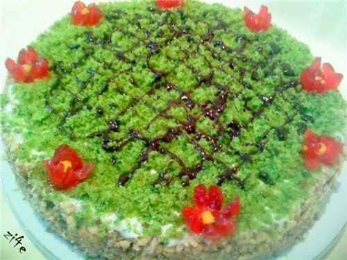 Преместваме кората в подмазана тавичка и навиваме краищата на вътре /така образуваме борд/и оформяме квадрат.