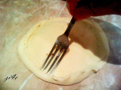 Прегъвам  краищата на долният кръг върху краищата на горния и притискам с вилица.