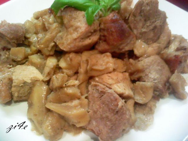Сложих го в йена глас тавичка и добавих нарязаните гъби ,черният пипер ,маслото и долях от бульона където е вряло месото около 1 чаша.