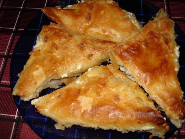Слагате в голяма купа яйцето, солта, олиото и водата. Започвате да прибавяте брашното, докато получите тесто, което може да месите с ръце, без да ви се лепи много. Тук мога да добавя,че и повече вода да сте сложили, няма голямо значение. Добавяте брашно, колкото е необходимо. Тестото се дели на 3 топки. Маслото го стопявате. Разточвате всяка топка на кора, колкото можете тънка, намазвате с разтопената мазнина обилно. Сгъвате кората на 4 като салфетка. По същия начин се точат и сгъват другите кори. Оставете на страна за кратко.