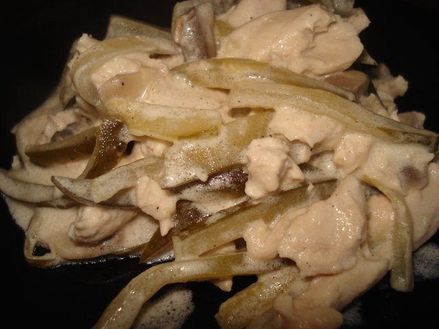 Пилето и зеленчуците се режат на жулиени (тънки и дълги ивички, гъбите на филийки).