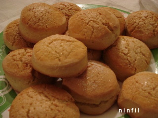 Подредете ги в тава, не е нужно да е намазана и ги печете на 200 градуса до много бледо розово. Горещи се посипват с пудра захар. Съхранявайте ги покрити с фолио или съд с капак.