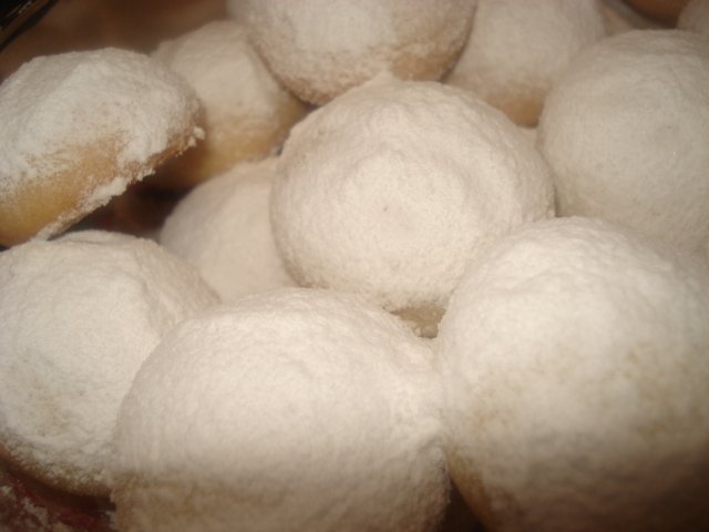 С помощта на чаена лъжичка се отчупва от сместа, оформят се с ръце топчета. Оваляйте ги обилно в пудрата захар и подредете на около 4 см. едно от друго в тавата. Пекат се 10-15 минути до разпукването им. От вътре остават меки,а отгоре леко подсъхнали. Горещите сладки се оставят 2 мин в тавата леко да се охладят и чак тогава се нареждат в поднос.