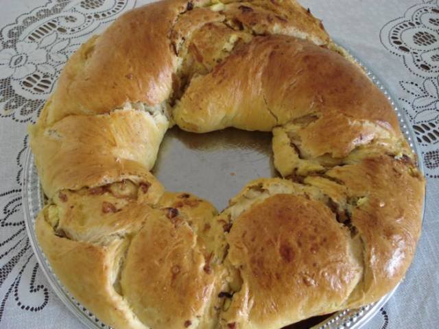 Замесва се меко тесто от посочените продукти. Оставя се да втасана топло. Готовото втасало тесто премесвате за кратко и го делите на 4 равни части. Оформя се на топки. Всяка топка се разточва елипсовидно. Намазва се с лютеница или разредено с малко вода доматено пюре. На едната половина се подреждат резените луканка или друг колбас. В другата половина се слага кашкавала, нарязан на по-плътни филийки. Прегъва се по дължина от двете страни около 1 см. Двата края се усукват като бонбон. В средата се чуква яйцето като се внимава жълтъка да остане цял. Пекът се в загрята на 200 градуса фурна до зачервяване или до готовност на яйцето.