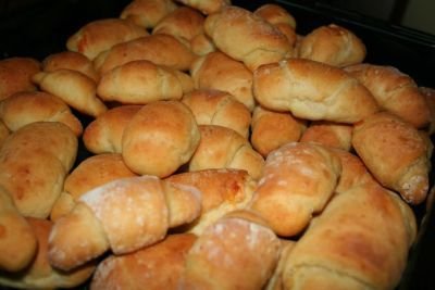 Като се омеси тестото се слага в купа, завива се с фолио и се оставя в хладилник поне за 5-6 часа. След това се вади, разделя се на 8 части. Всяка част се разточва на кръг и се реже на 8 триъгълника. Навиват се на кифлички и се пекат на 180 градуса на горен и долен реотан до зачервяване.