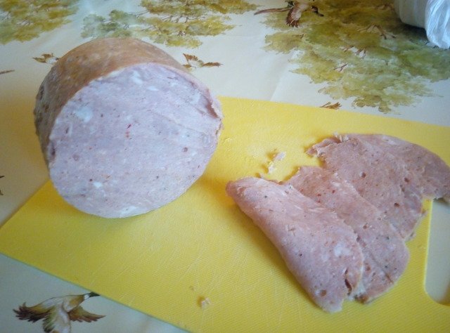 Ето и от мен- шунка от заешко месо и смляно свинско. Добавила съм кисели краставички и сушени червени домати